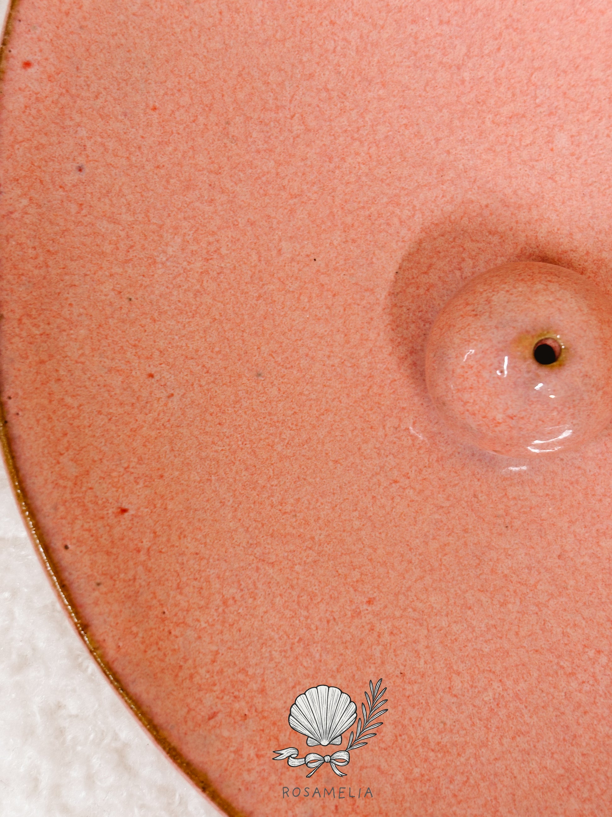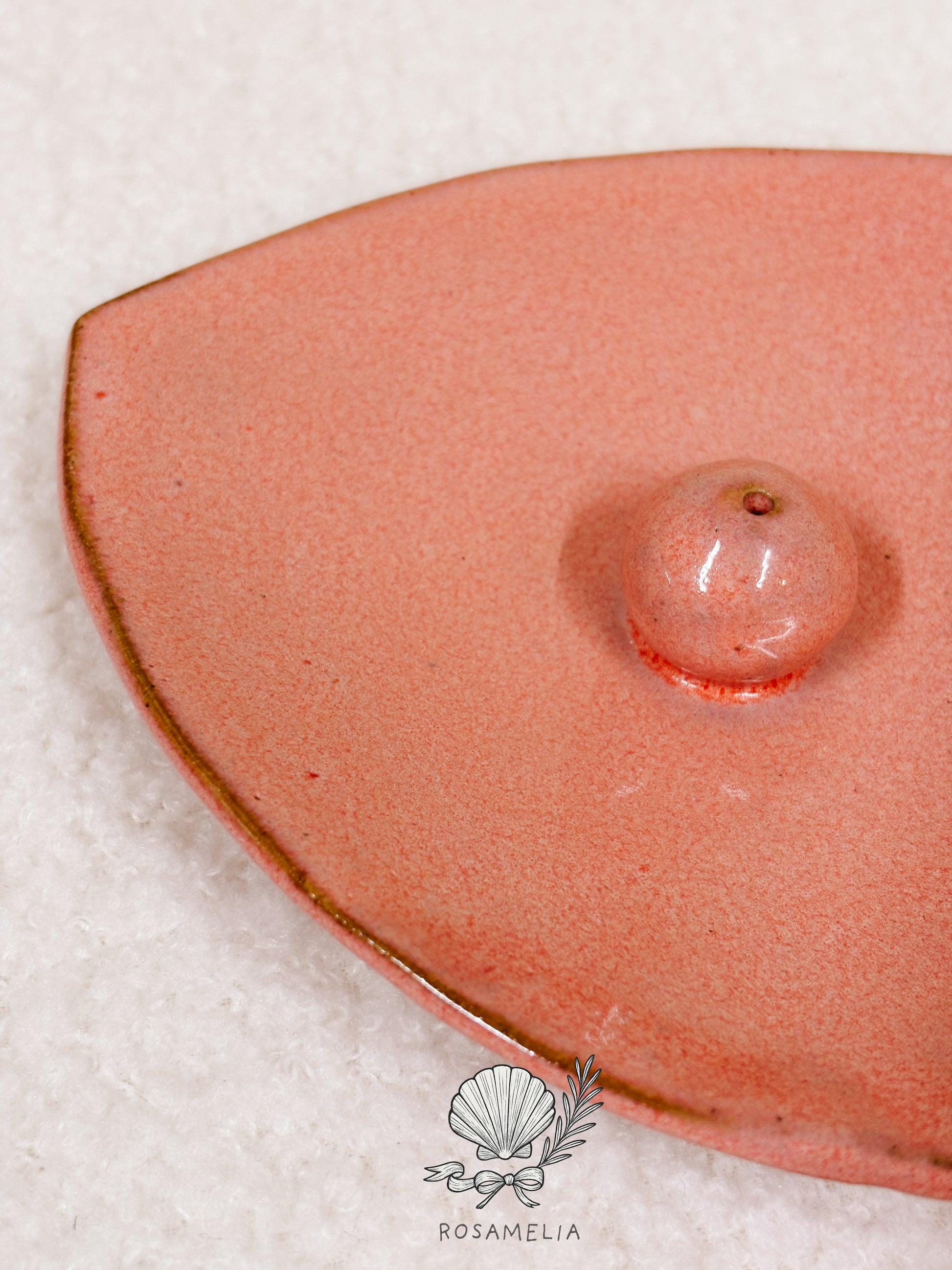 Porta incenso in ceramica artigianale, realizzato a mano e rifinito con una smaltatura rosa caldo, polverosa e naturale. La superficie è morbida alla vista, con leggere variazioni di tono che raccontano il processo manuale e rendono ogni pezzo unico.